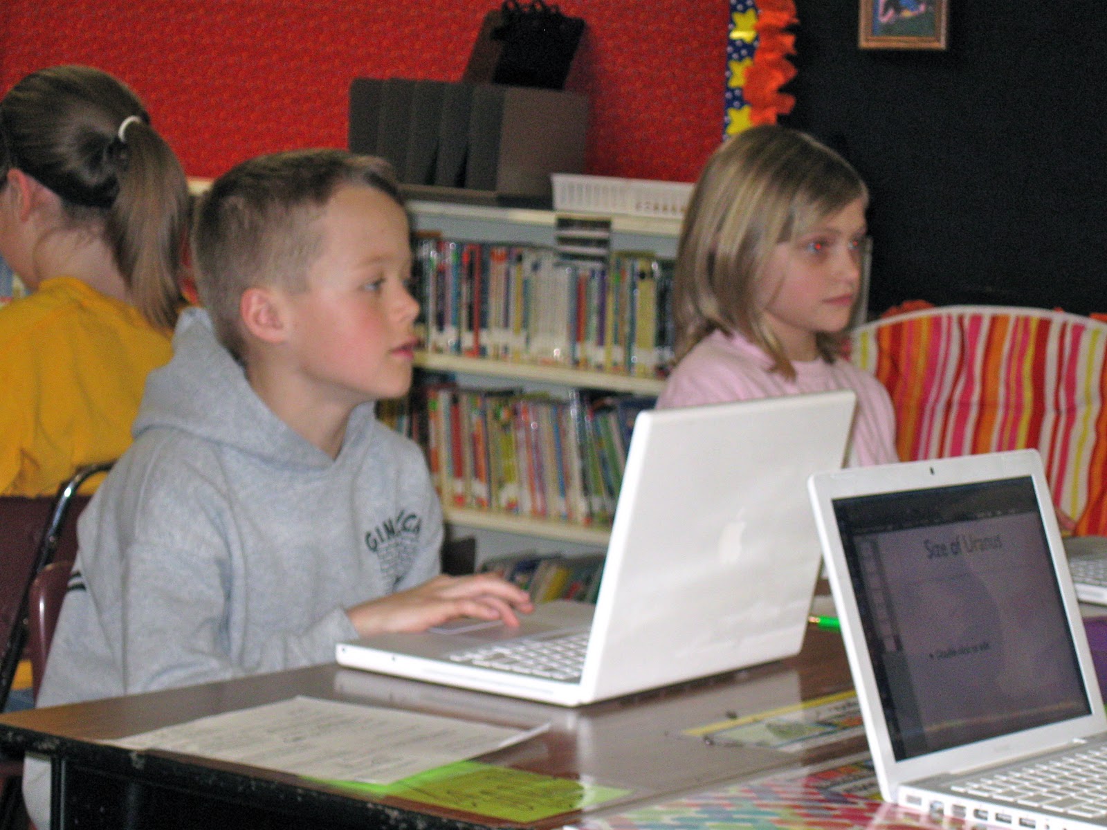 We have been busy researching planets in our solar system. We are now in the process of creating a Keynote presentation. Keynote is very similar to PowerPoint. Here we are working hard on the mobile computer lab laptops.